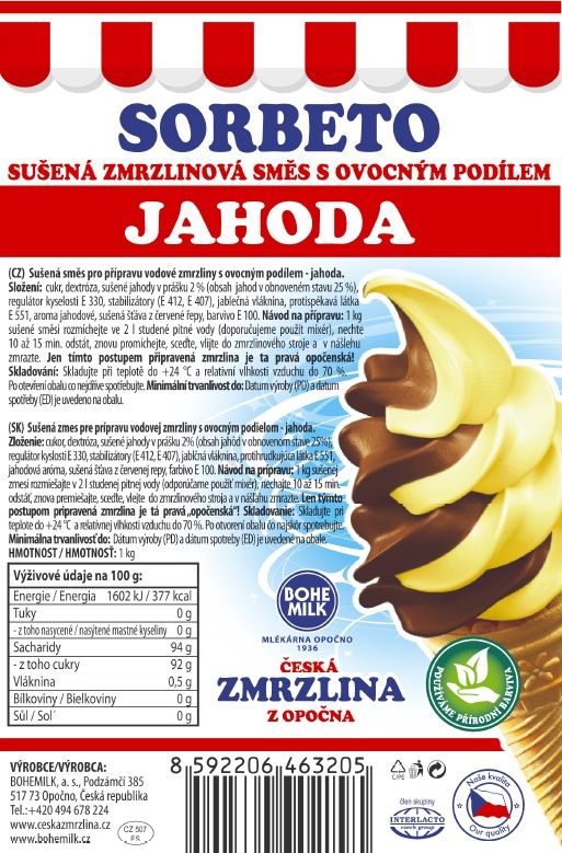 1 kg sušené zmrzlinové směsi rozmícháme ve 2 litrech studené pitné vody. Necháme 15 minut odstát, znovu promícháme, scedíme, vlijeme do zmrzlinového stroje a v nášlehu zmrazíme. Sorbetovou zmrzlinovou směs lze používat i ve strojích s čerpadly.