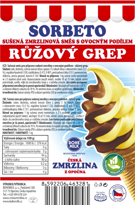 1 kg sušené zmrzlinové směsi rozmícháme ve 2 litrech studené pitné vody. Necháme 15 minut odstát, znovu promícháme, scedíme, vlijeme do zmrzlinového stroje a v nášlehu zmrazíme. Sorbetovou zmrzlinovou směs lze používat i ve strojích s čerpadly.